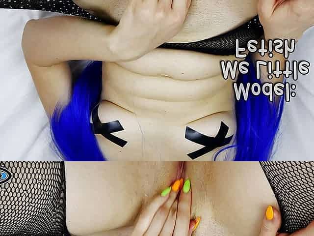 Blue colored hair horny petite maid masturbation with big labia, real orgasm from vibrator
