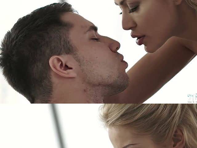 Sexy blond girlie Kate England swallows massive cock of her buddy ardently