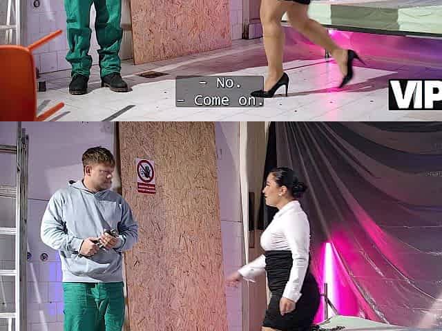VIP4K. Older Mrs. Boss is masturbating during her lunch break and screwing a stranger electrician