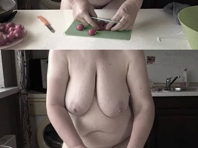 Naked mature bbw housewife with big saggy tits is cooking in the kitchen.