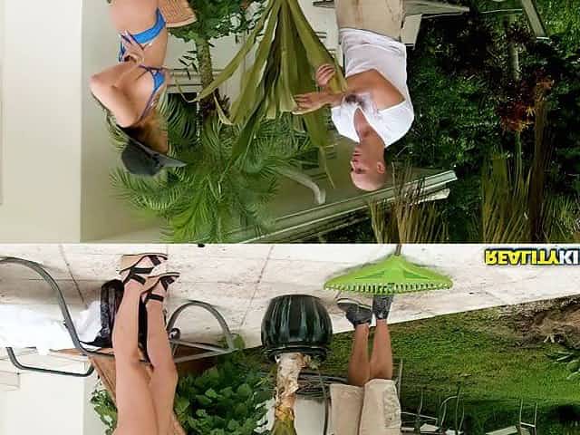 Naughty and horny brunette strips out of her bikini make a sex ta