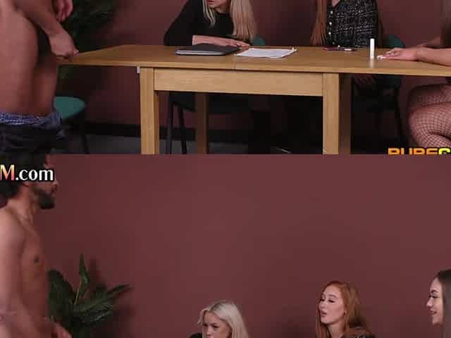 Casting CFNM female agent tugging black cock