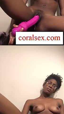 Slim ebony cam girl fucks her pussy with pink dildo