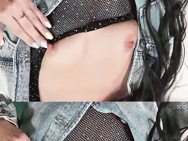 Big tits brunette amateur hottie strips her black thong off and masturbates