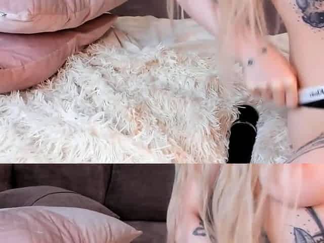 Masturbating blonde teen on couch with big toys
