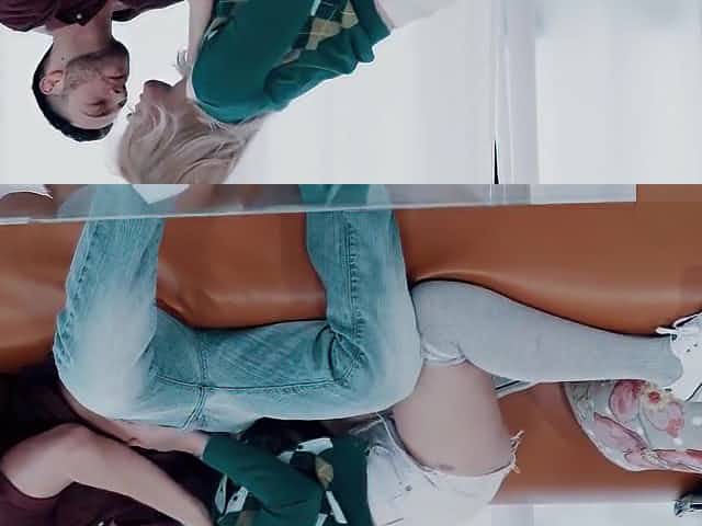 Confident blonde teen with natural tits riding huge dicks doggystyle in threesome sex
