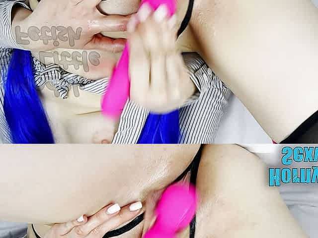 Masturbation horny big labia lips pussy by naughty petite secretary in uniform blouse, no panties, anal butt plug