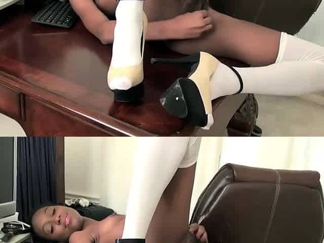 Vikki Fox in a Blouse, Skirt, Black Pantyhose Teasing Legs and Feet