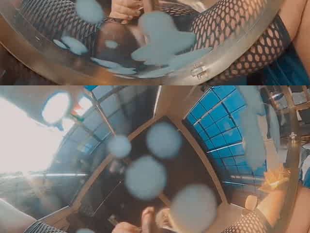 Outside on my balcony naked in a crotchless fishnet bodystocking, i massage my tits, rub my pussy and taking a dildo
