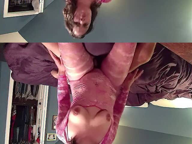 Babe in a fishnet body stocking gets laid on her side and boned