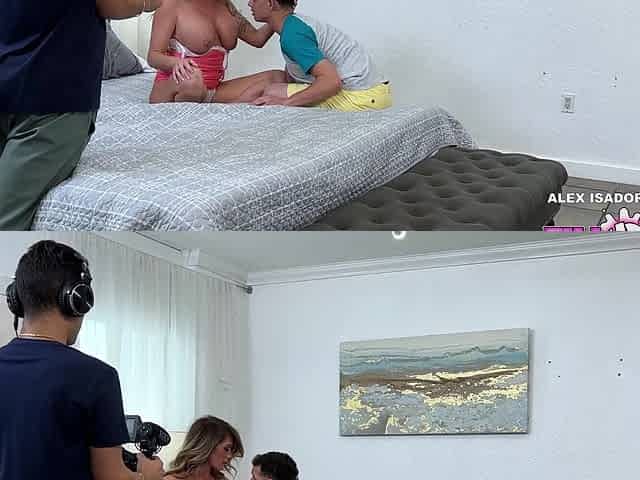 Milf in stockings seduces her stepson on the bed