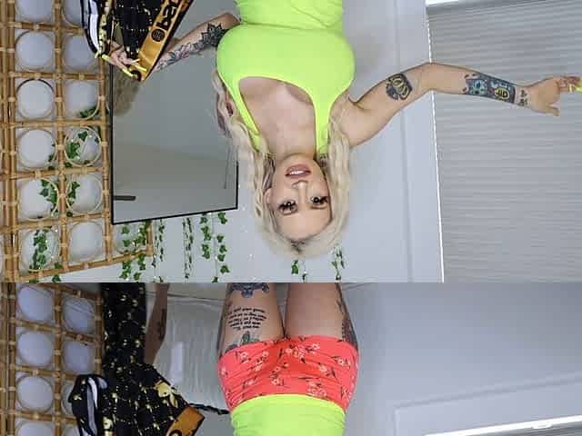 Busty blonde babe tries on PSD sets: sports bra and tight shorts/thongs