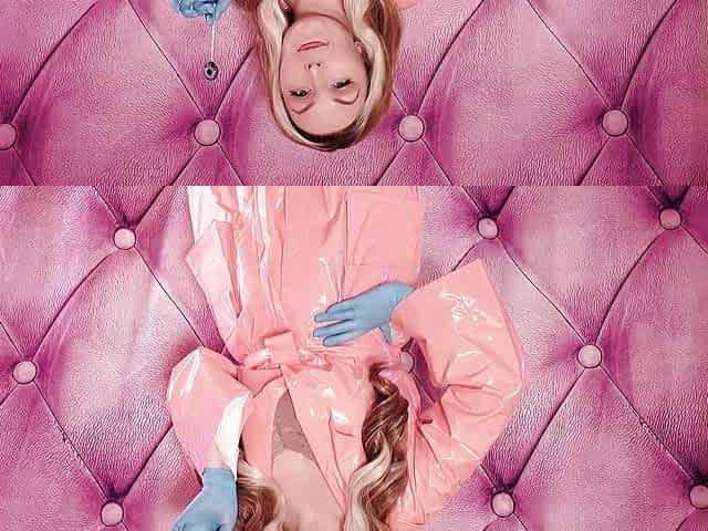 ASMR: blue nitrile gloves and candy sucking, wearing pink PVC coat, girl in braces (Arya Grander)