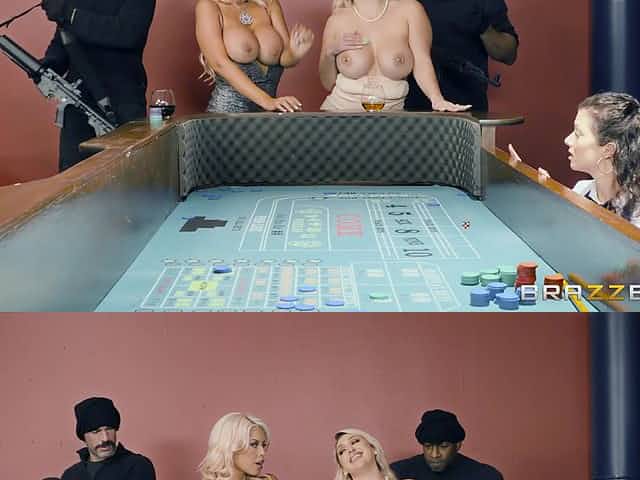 Bridgette B and Nina Kayy show off their huge tits to a pair of robbers