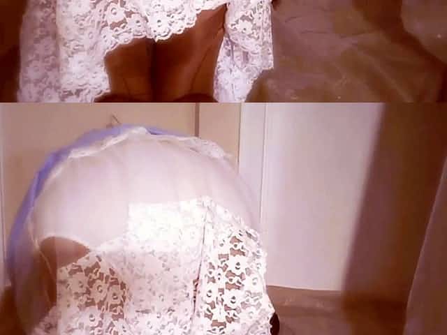 Sexy Brunette Hair Lets u look up her Petticoat and Jack Off over her Twat!