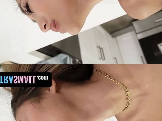 Step daughter Mira Monroe gets down on all fours behind the counter and sucks her step dad\u2019s cock - familystrokes