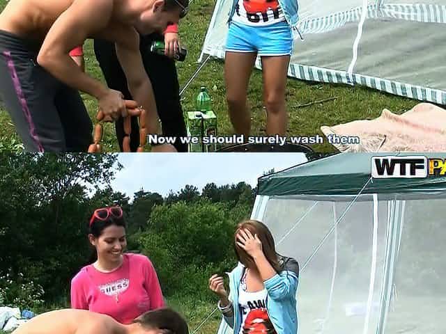 Nude girl goes camping and ends up fucking all day