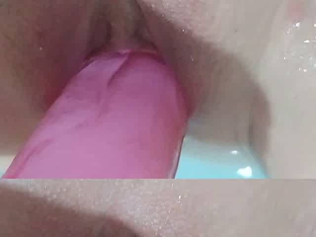 Hard fucking with a dildo in the bathroom. Close-up. Cumming