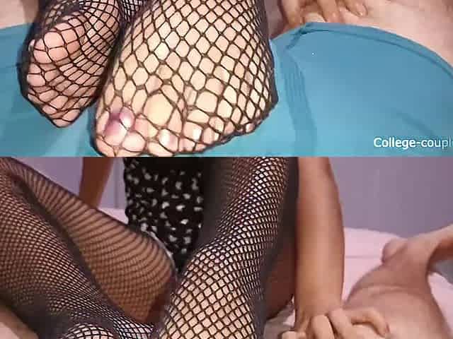 Footjob in fishnets, cum in lingerie, cock worship, bulge licking