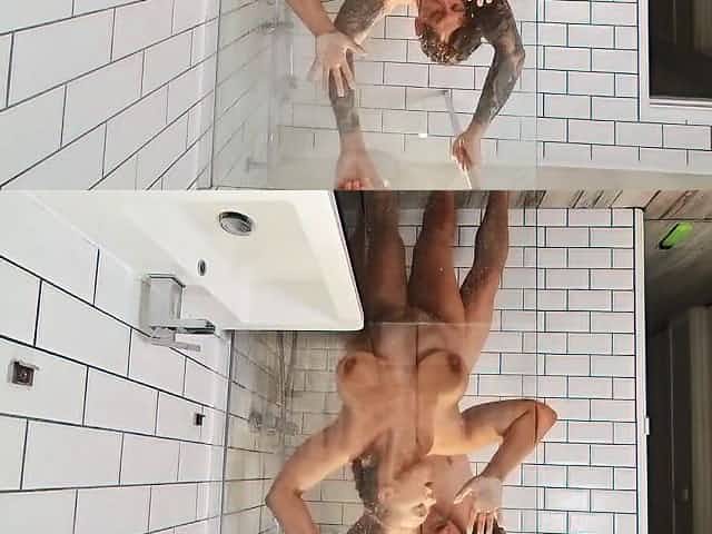 Guy with tattooed hands drills wife's pussy in the shower room