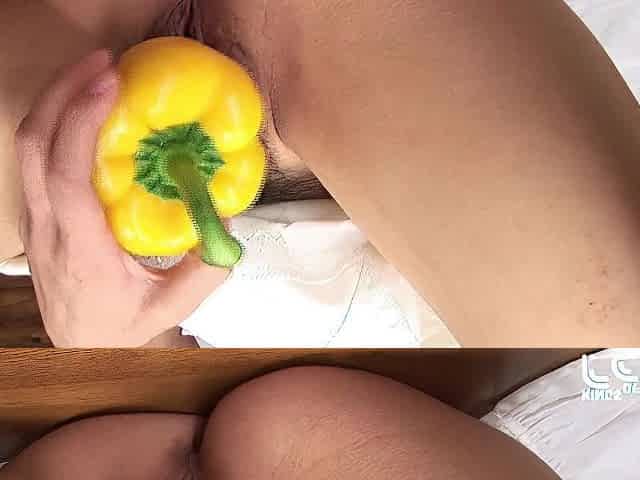 Horny Japanese babe satisfy her hairy pussy with vegetables in the kitchen