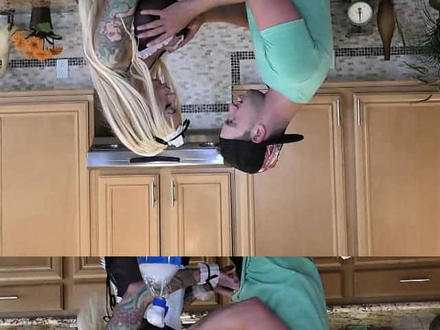 Busty blonde maid Lolly receives a creampie in the kitchen