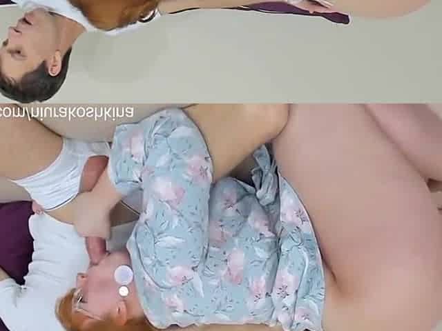 Freckled Russian in braces and white hair cheating and taking cumshots