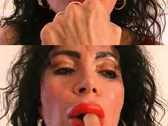 Oriental slut stuffs her mouth with a massive wet dicl