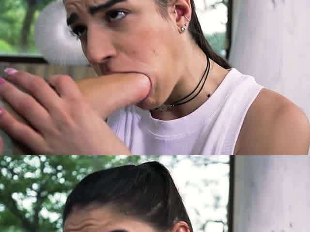 Small tit brunette gives a nice hard blowjob and fuck