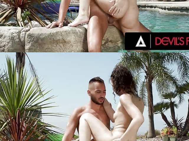 Skinny pornstars Polly Petrova and Natasha Rios have sex by the pool