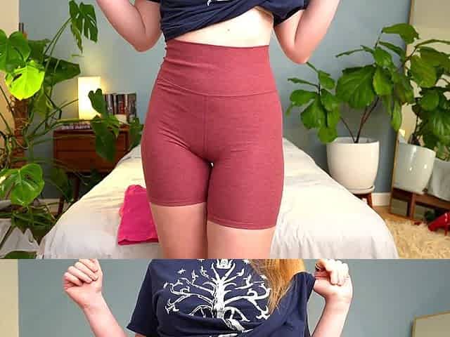 Fit sandy-haired Clarabelle Woods shows off in hot pink yoga pants and booty shorts