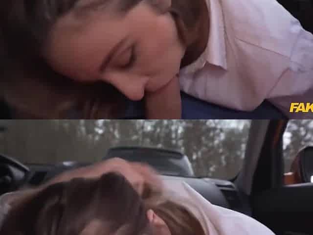 Fake driving instructor doggy fucks a ginger cutie in a car