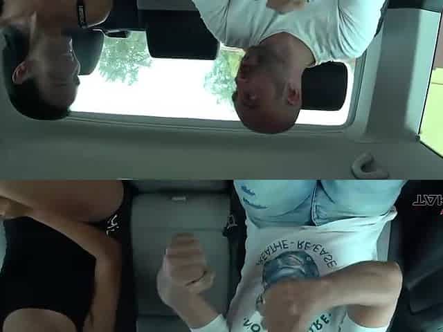 Titless pallid chick gets picked up and fucked hard in the car by bearded stud