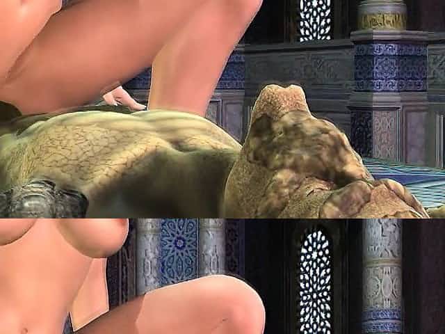 3D cartoon orc gets fucked by a babe with a strap on