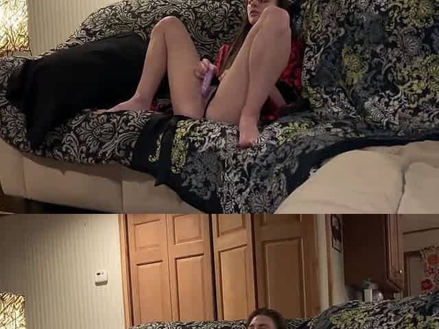 Horny little Katt Lowden spreads wide on the couch to show and toy it