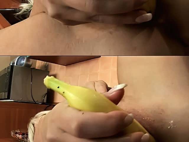 In the kitchen, skinny blonde teen Cathy slides a banana in and out of her pussy