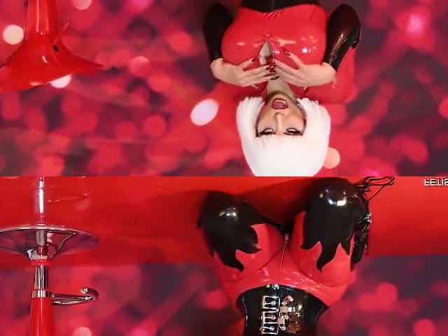 Blonde in red kinky latex catsuit shows her sexy body