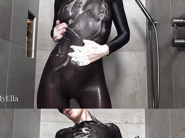 "Getting wet in my ultra shiny catsuit"