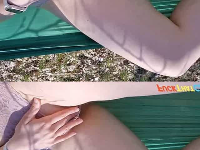 Teen girl caught masturbating in a hammock outdoors.