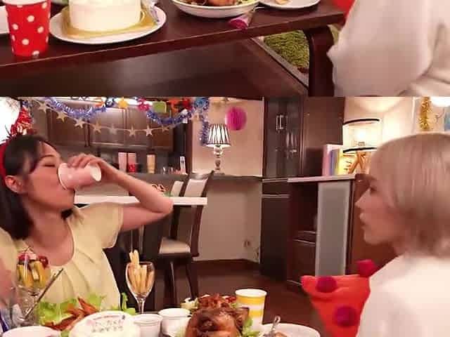 Two female college students press their bodies together and lick each other's nipples and cum on each other.