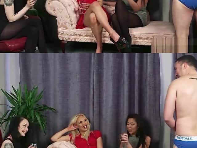 Group of amateur CFNM girls suck CFNM stripper