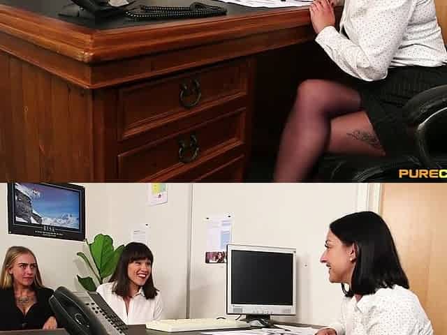 Beautiful women with tattoos have a hot office affair.