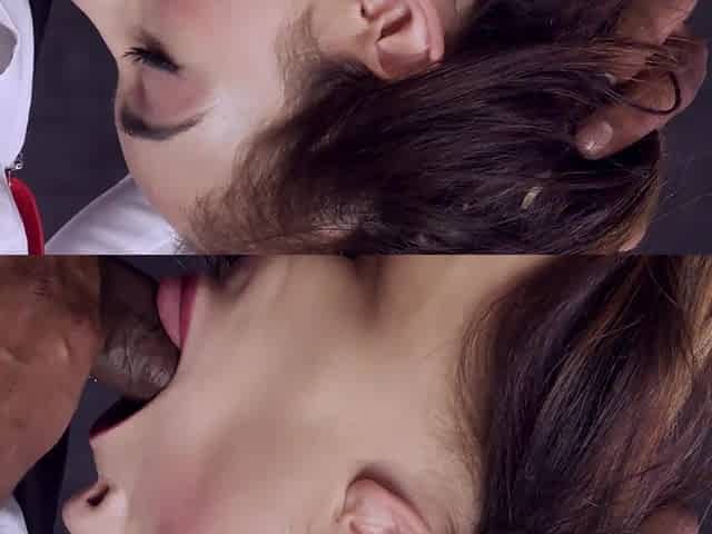 Brunette Ginebra Bellucci with shaved pussy getting cum in mouth