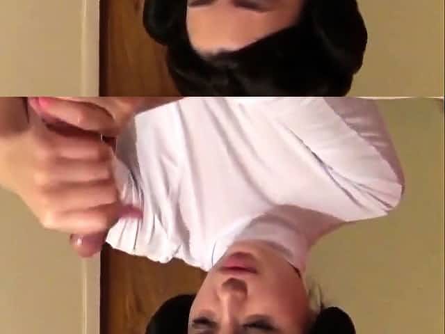 Asian cutie strokes man's cock with feet and gives a blowjob