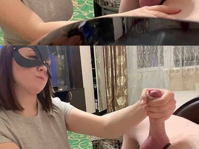 Intense domination as he gives a firm handjob while sitting in front of him