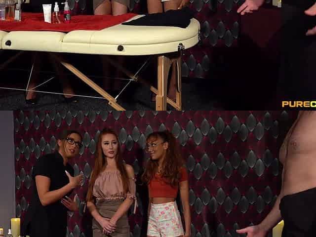 Jamie Knight wears sexy lingerie and thong while giving a cfnm massage.