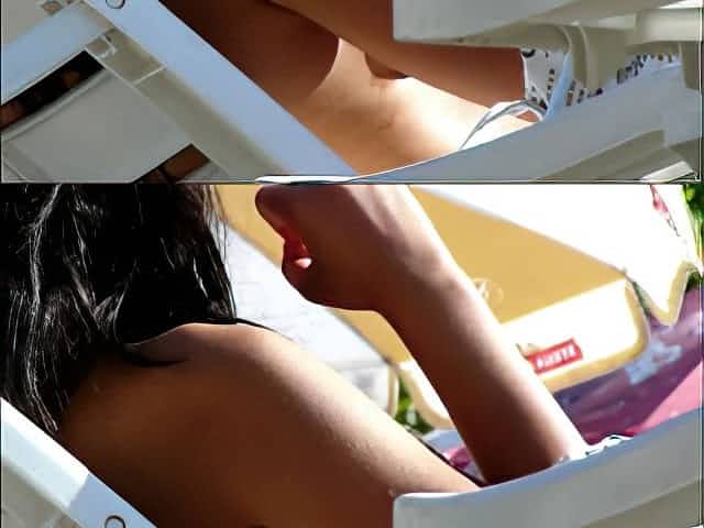 Hidden cam on beach topless brunette