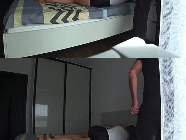 An unsatisfied lascivious wife gets fucked into ass by a hotel electrician in front of her resting spouse.