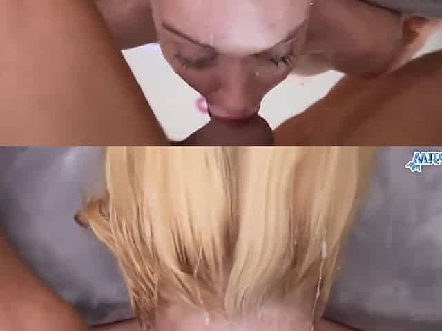 Carmela Clutch and Chloe Cooper share cumshots after pussy fucking