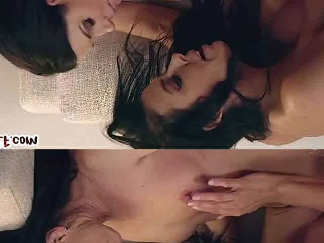 Beautiful women with long hair undress and have sex in a hot scene.